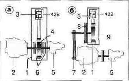 Рис. 2.11.Кинематические схемы соединения стартер-генераторов фирмы Bosch с двигателем:а- при установке между двигателем и коробкой передач; б - при внешней установке; 1 - стартер-генератор; 2 - двигатель внутреннего сгорания; 3 - электронная система управления; 4 - асинхронная электромашина; 5 - коробка передач; 6 - сцепление; 7 - ременная передача; 8 - редуктор; 9 - электромашина с клювообразной магнитной системой.