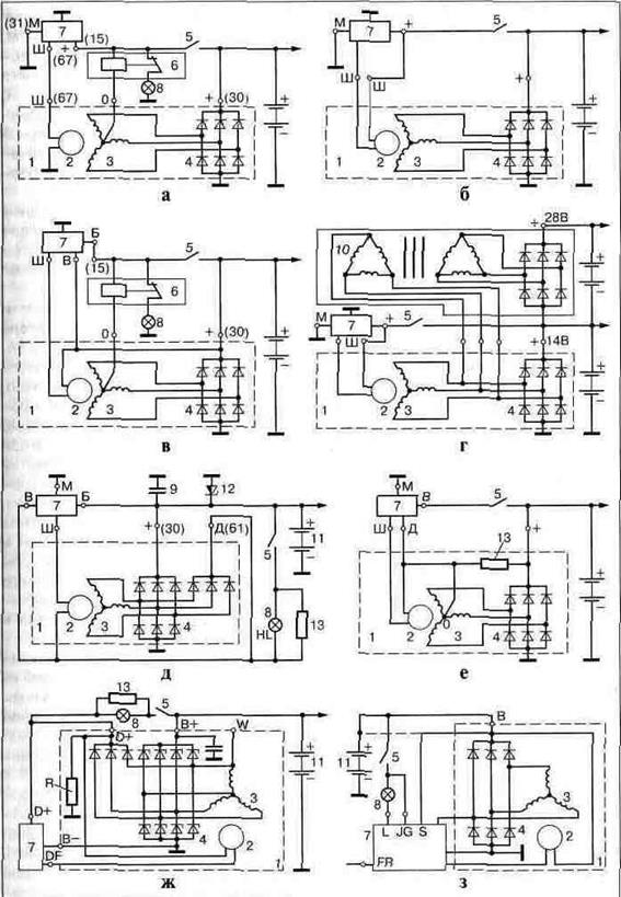 Некоторые фирмы применяют включение контрольной лампы через разделительный диод, а в схемах 1.1, д, ж включение ее идет через контактное реле. В этом случае обмотка реле включается на место контрольной лампы. Если генераторная установка работает в комплексе с датчиком температуры электролита, она имеет дополнительные выводы для его подсоединения.