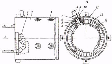 1 - катушка; 2 - корпус; 3 - винт полюса; 4 - изоляционная втулка; 5,6 - соответственно уплотнительная и изоляционная шайбы; 7 - шайба; 8 - выводной болт; 9 - гайка М12; 10 - пружинная шайба; 11 - изоляционный материал; 12 – полюс.