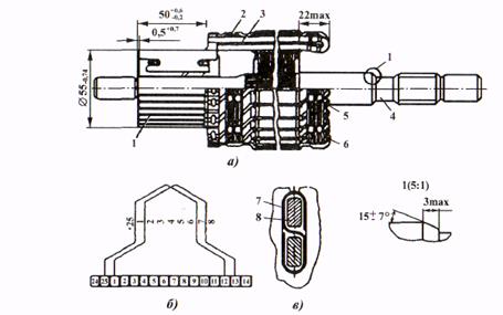 а - в сборе; б - схема обмотки; в - конструкция паза; 1 - коллектор; 2 - проволока М-06 бандажа якоря; 3 - изоляционный материал; 4 - вал; 5 - крепежная скоба бандажа; 6 - прокладка под бандаж; 7 - изоляционный материал паза; 8 - провод марки ПММ.