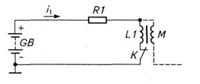 Рис. 1.3. Схема замещения классической системы зажигания после замыкания контактов прерыватели (К – контакты прерывателя, М - взаимоиндукция).