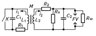Согласно этой схеме имеем два магнитосвязанных контура, каждый из которых содержит емкость (С1 - конденсатор первичной цепи; С2 - распределенная емкость вторичной цепи), индуктивность (L1, L2 - индуктивности соответственно первичной и вторичной обмоток катушки зажигания), эквивалентное активное сопротивление (R1, R2 - суммарные активные сопротивления соответственно первичной и вторичной цепей). Во вторичный контур включены шунтирующее сопротивление Rш и сопротивление потерь Rп, учитывающее соответственно утечки тока на свече и магнитные потери.