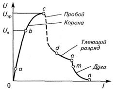 Участок Оаbсоответствует несамостоятельному разряду. Напряжение возрастает, ток остается практически неизменным и по силе ничтожно мал. При дальнейшем увеличении напряжения скорость движения ионов по направлению к электродам увеличивается. При начальном напряжении Uн, начинается ударная ионизация, т. е. такой разряд, который, однажды возникнув, не требует для своего поддержания воздействия постороннего ионизатора. Если поле равномерное, то процесс ионизации сразу перерастает в пробой газового промежутка. Если поле неравномерное, то вначале возникает местный пробой газа около электродов в местах с наибольшей напряженностью электрического поля, достигшей критического значения. Этот тип разряда называется короной и соответствует устойчивой части вольт-амперной характеристики bс. При дальнейшем повышении напряжения корона захватывает новые области межэлектродного пространства, пока не произойдет пробой (точка с), когда между электродами проскакивает искра. Это происходит при достижении напряжением значения пробивного напряжения Uпр.