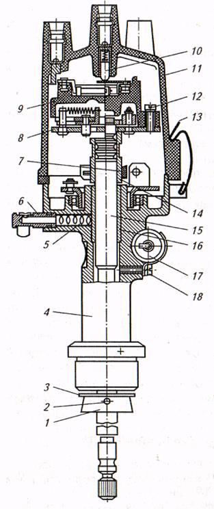 На корпусе установлен конденсатор 17. На пластине кулачка 14 закреплен ротор-бегунок 9 с помехоподавительным сопротивлением. Корпус прерывателя закрыт крышкой 11, в центр которой установлен уголек 10, нагруженный пружиной. Крышка крепится к корпусу двумя пружинными защелками 13. Для предотвращения проникновения моторного масла под корпусом распределителя на валу установлен маслоотражательный диск 1. Распределитель приводится в действие от шестерни привода масляного насоса, в которую входят шлицы вала распределителя. На корпусе устанавливается вакуумный автомат, который работает в зависимости от нагрузки двигателя (не рисунке не показан).