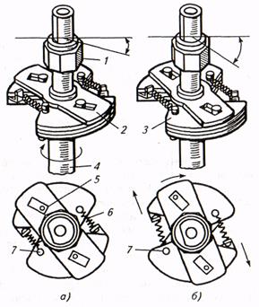 На ведущем валике 4 закреплена пластина с осями 7 для установки грузиков 3. Грузики могут проворачиваться вокруг осей 7 и связаны между собой пружинами 6. На каждом грузике имеется штифт 5, входящий в прорези пластины 2, укрепленной на втулке кулачка 1. Привод кулачка осуществляется от валика через грузики. С увеличением частоты вращения, начиная с некоторого ее значения, грузики под действием центробежной силы расходятся. При этом штифты, двигаясь в прорезях пластины, поворачивают ее и связанный с ней кулачок в сторону вращения ведущего валика.