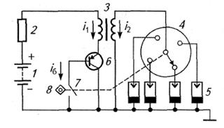 Рис. 3.20. Принципиальная схема КТСЗ: 1 - аккумуляторная батарея; 2 - добавочное сопротивление; 3 – катушка зажигания; 4 - распределитель зажигания; 5 - свечи; 6 - транзистор; 7- контакты прерывателя; 8 - кулачок