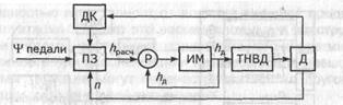 Структурная схема системы показана на рис. 2.2. Она состоит из программного задатчика положений рейки ПЗ, вычисляемых по значениям частоты вращения коленчатого вала двигателя п, положению педали управления подачей топлива ψпедали и информации от датчиков коррекции ДК; регулятора Р, вычисляющего рассогласование между расчетным значением положения рейки hрасч и действительным hд; исполнительного механизма ИМ, включенного в контур регулятора и формирующего интегральную составляющую топливного насоса высокого давления ТНВДи двигателя Д.