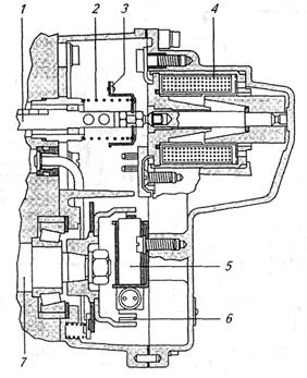 Рис. 2.5.Электромагнитное устройство управления рейкой ТНВД: 1 – рейка; 2 – возвратная пружина; 3 – датчик положения рейки; 4 – управляющий электромагнит; 5 – датчик частоты вращения; 6 – зубчатое колесо датчика частоты вращения; 7 – кулачковый вал ТНВД