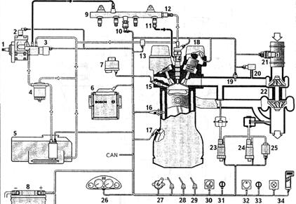 Рис. 2.6. Система топливоподачи дизельного двигателя Bosch Common Rail: 1 – топливный насос высокого давления; 2 – перепускной клапан; 3 –электромагнитный клапан – регулятор давления; 4 – топливный фильтр; 5 –топливный бак с топливоподкачивающим насосом и предварительным фильтром; 6 – электронный блок управления; 7 – реле включения свечей накаливания; 8 – аккумуляторная батарея; 9 – топливная рампа-аккумулятор; 10 – датчик давления топлива в рампе; 11 – топливный жиклер; 12 – предохранительный клапан; 13 – датчик температуры топлива; 14 – электромагнитная форсунка; 15 – свеча накаливания; 16 – датчик температуры охлаждающей жидкости; 17 – датчик положения коленчатого вала; 18 – фазовый дискриминатор; 19 – датчик температуры воздуха на впуске; 20 – датчик давления наддува; 21 – пленочный датчик массового расхода воздуха; 22 – турбокомпрессор; 23 – пневматический клапан управления рециркуляцией; 24 – пневматический клапан управления наддувом; 25 – вакуумный насос; 26 – приборная панель; 27 – датчик положения педали управления топливоподачей; 28 – датчик нажатия педали тормоза; 29 – датчик выключения сцепления; 30 – датчик скорости автомобиля; 31 – пульт управления круиз-контроля; 32 – компрессор кондиционера; 33 – переключатель кондиционера; 34 – аварийная лампа и диагностический разъем