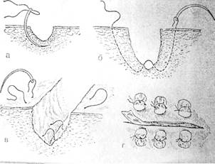 а- проведение иглы с нитью под дном раны, б- проведение нити при широкой ране, в- наложение П-образного шва, г- П- образный шов завязан над шариками марли.