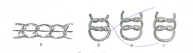 а- вид узловатого шва на рану, б- хирургический узел, в- простой узел, г- морской узел.