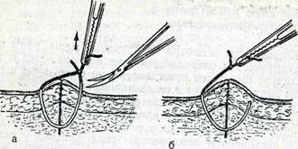 а- подтягивание и пересечение нити, б- извлечение нити.