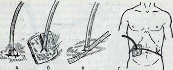а- крепление лигатурами, б- «штанишки» из марли, в- фиксация трубки полоской лейкопластыря, г- фиксация трубки полоской марли.