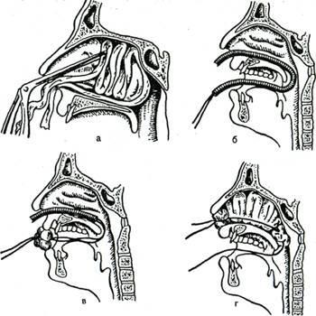 а- передняя тампонада, б, в, г- этапы задней тампонады.