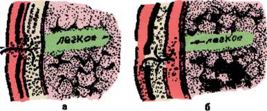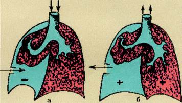 Рис. 12 Схема образования подкожной эмфиземы: а- вдох, б- выдох.