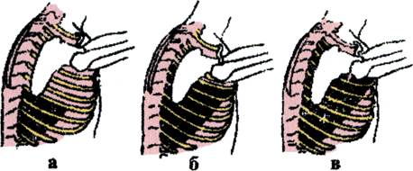 Рис. 14 Гемоторакс: а- малый, б- средний, в- большой.