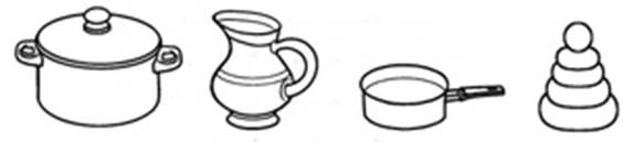 «Найди лишний предмет» (рис. 17, с. 39). Спросите малышей, какой из предметов, изображенных на рисунке, лишний. (Среди посуды лишней окажется пирамидка, так как это игрушка, а не посуда).