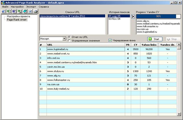 Рис. 5. Анализ сайтов, занимающих первые 10 мест в выдаче поисковой системы Яндекс по запросу "производители мебели" в программе Semonitor