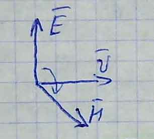 Вектора напряжённости электрического поля E, магнитного поля H и скорость распространения волны V взаимно перпендикулярны и образуют правовинтовую систему.