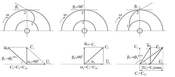 , и абсолютная скорость направлена в сторону, обратную вращению колеса, насос переходит в режим работы турбины;