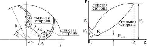 В центробежном насосе кавитация возникает на лопатке рабочего колеса обычно вблизи ее входной кромки. Давление здесь значительно ниже давления во входном патрубке, что связано с возрастанием скорости при обтекании лопатки. Неравномерное поле абсолютных скоростей при подходе к лопатке также вызывает падение давления по сравнению со средним на входе. Как показывает опыт, область пониженного давления находится с тыльной стороны входной части лопаток (рисунок 3.22)