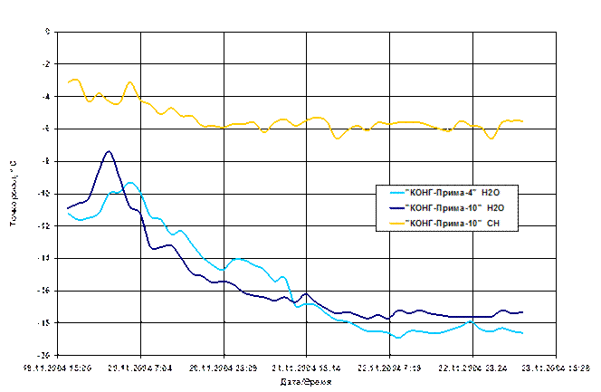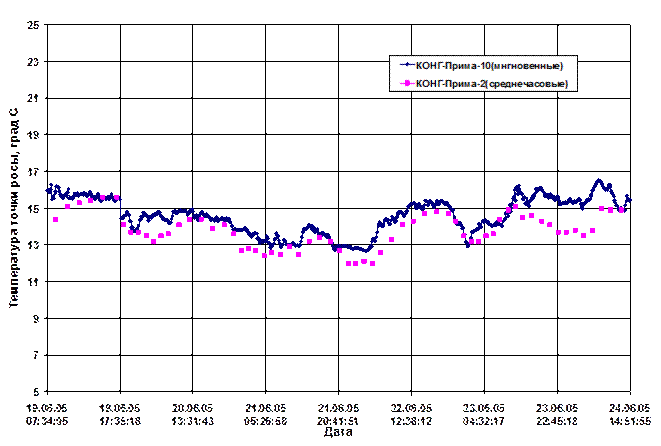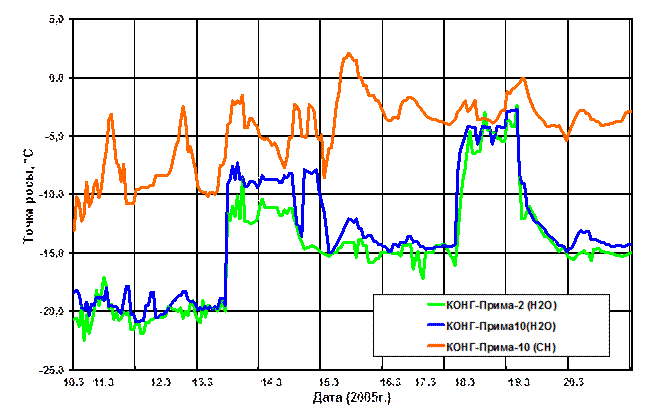 Анализатор «КОНГ-Прима-10» среагировал на эти изменения повышением точки росы по влаге, в то время как показания гигрометра «КОНГ-Прима-2» за исключением короткого периода (с 7:00 23.03 до 17:00 24.03) оставались на уровне минус 15°С.
