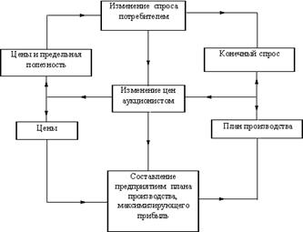 В качестве хозяйственных субъектов, участвующих в процессе функционирования рынка, выберем два предприятия, каждое из которых, располагая одним доступным им обоим ресурсом (например, трудом), производит по одному виду продукции конечного спроса, и одного потребителя, предъявляющего этот спрос. Условимся также, что обмен осуществляется через единственного посредника – аукциониста. В этом случае экономический цикл будет выглядеть так (рис. 55):