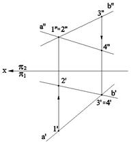 Видимость двух скрещивающихся прямых (одна прямая на той или иной плоскости проекций может перекрывать другую прямую или быть перекрыта этой прямой). Для определения “видимости” линий в этом случае можно воспользоваться так называемыми “конкурирующими” точками, то есть точками, лежащими на одной проецирующей прямой. На рис.2.15 такими конкурирующими точками являются точки 1 и 2 и 3 и 4.