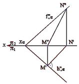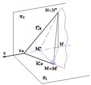 Поскольку линия наибольшего наклона перпендикулярна соответствующей линии уровня данной плоскости, то очевидно, что с помощью только одной линии - линии уровня плоскости по отношению к той или иной плоскости проекций, можно задать плоскость общего положения в пространстве. На рис.3.12 плоскость b задана линией наибольшего наклона к фронтальной плоскости проекций - линией n. Второй линией в этом случае является линия фронтали f, которую можно провести через любую точку линии l наибольшего наклона данной плоскости.