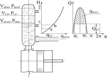 Наглядно представить значение пневмокомпенсатора (колпака) на нагнетании можно, если показать, как изменяется напор в трубопроводе в зависимости от подачи насоса. На рисунке 6.24 в координатах H-q показано, что при отсутствии колпака напор в трубопроводе изменяется по пунктирной линии от нуля до НМАХ, а при наличии колпака напор незначительно отклоняется от среднего значения