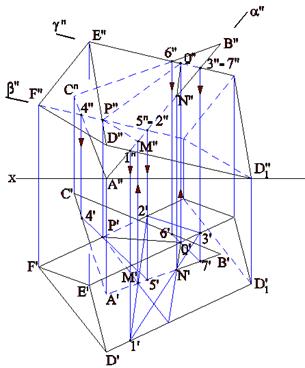 и вспомогательных секущих плоскостей b(b`) и g(g``), с помощью которых найдены соответственно точки P и Q линии MPQN пересечения призмы DEFD1E1F1 c треугольником АВС.