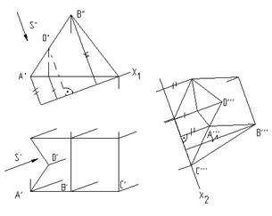 Решение: Поскольку направление S параллельно фронтальной плоскости проекций, то новую плоскость проекций выбираем перпендикулярно направлению S`` и строим изображение этой фигуры на этой плоскости.