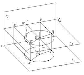 Если некоторая точка А вращается вокруг проецирующей прямой i, то она будет перемещаться по окружности, плоскость которой перпендикулярна оси вращения, а, следовательно проецироваться эта окружность на плоскость проекций, перпендикулярную оси вращения, будет без искажения (рис.6.7, 6.8).