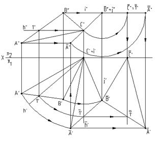 Для решения 4-й основной задачи достаточно продолжить построения и повернуть плоскость треугольника АВС вокруг проецирующей прямой j так, чтобы она расположилась параллельно горизонтальной плоскости, плоскости p1. Четвертая задача на преобразование решена.