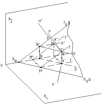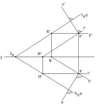 Если в пространстве прямая перпендикулярна плоскости, то на чертеже горизонтальная проекция прямой должна быть перпендикулярна к горизонтальной проекции горизонтали плоскости, а фронтальная проекция - к фронтальной проекции фронтали этой плоскости (рис.7.4, 7.5).