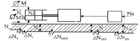 Мощность, потребляемая насосом NДВ, расходуется на полезную мощность Nn и потери мощности на утечки через неплотности ∆NY, на гидравлические сопротивления в клапанах, каналах насоса и участках трубопроводов до мест установки приборов давления ∆NГ, на механическое трение ∆Nмех уплотнениях, опорах, кривошипно-шатунном механизме, редукторе и др. (см.рисунок 6.25).
