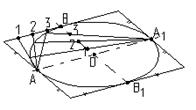 Проводятся две концентрические окружности радиусами ОА и ОВ, а затем из центра О - произвольно выбранные лучи, пересекающие обе окружности в точках 1 и 2 соответственно. С помощью лучей: 11-М1 и 21-М1 соответственно находят точки М1 очерка эллипса.
