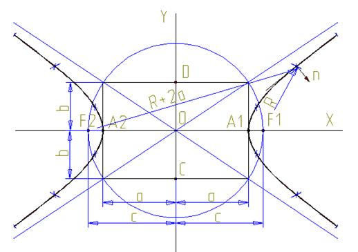 Множество точек гиперболы находят так: из фокусов F1 и F2 радиусами Ri и Ri+2a постепенно увеличивая радиус Ri проводят серию дуг окружностей. Точки пересечения этих дуг и есть искомые точки гиперболы, как это сделано на чертеже.