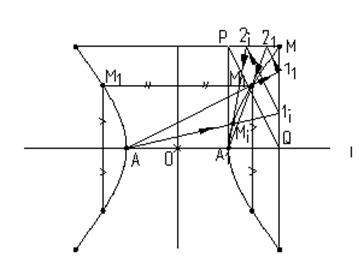 Через точку М проводят прямые линии, параллельные осям гиперболы и получают прямоугольник МРА1Q, а затем диагональ PQ. Из вершины А проводят произвольный луч, пересекающий МQ в точке 11, а из точки 11 - прямую, параллельную PQ, получая точку 21. Луч А121 пересечет луч А1 в точке М1, принадлежащей гиперболе. Аналогично находятся другие точки гиперболы. Вторая ветвь гиперболы симметрично найденной.