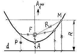 Парабола - множество точек плоскости, равноудаленных от точки (фокуса) и прямой (директрисы), лежащих в плоскости. Величина р - расстояние между фокусом и директрисой - параметр параболы. На этом свойстве и основано построение параболы, по заданным фокусу и директрисе (рис.9.6).