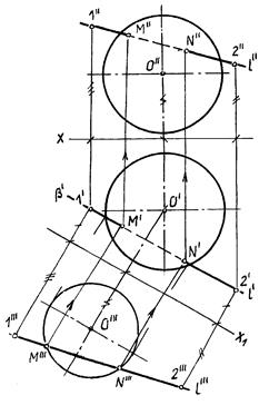 Решение легко находится после преобразования чертежа, после которого прямая l преобразуется в прямую уровня (фронталь).