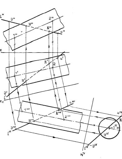 Преобразуем заменой плоскостей проекций чертеж так, чтобы цилиндрическая поверхность стала проецирующей. Одновременно с этим прямая l (1,2) преобразуется в линию lIV(1IV,2IV), точки пересечения которой с очерком цилиндрической поверхности - MIV и NIV и будут искомыми. Обратным преобразованием найдем эти точки на исходных проекциях. Построения ясны из чертежа.