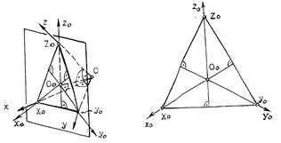 Если плоскость аксонометрической проекции пересекает плоскости пространственной системы координат, то фигурой сечения будет остроугольный треугольник XYZ - треугольник следов: XY, XZ и YZ. Оси пространственной системы координат спроецируются на плоскость аксонометрического изображения - высотами этого треугольника (совпадут с направлениями высот данного треугольника) (рис.11.3) и (рис.11.4).
