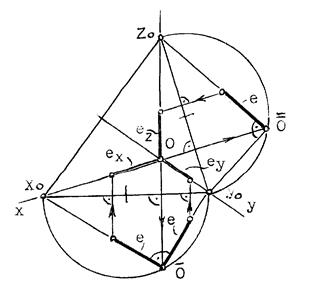 3. Отложив на направлении OX, OY и OZ отрезки равные e (единичный масштаб), находим его проекции: ех, еy и еz на аксонометрических осях.