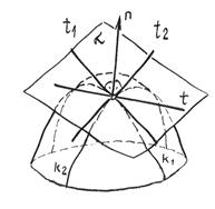 Проведя касательные к каждой из этих кривых линий, получим две пересекающиеся прямые, определяющие одну и только одну плоскость t, касательную к данной поверхности в точке К, если данная точка является “гладкой точкой” поверхности.