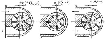 Изменяя эксцентриситет, можно регулировать подачу насоса. На рисунке 7.6 показаны положения ротора многопластинчатого насоса при разных эксцентриситетах.
