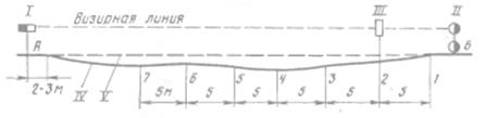 I - оптический прибор; II – рабочая рейка; III – визирная рейка; IV – положение головки рельса в профиле до выправки; V – положение головки рельса в профиле после выправки пути.