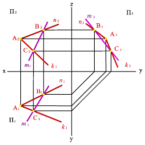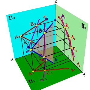 Проекция прямой m2 пересекает прямые n и k в точках В2 и С2, для нахождения недостающих проекций прямой необходимо найти недостающие проекции точек В и С как точек лежащих на прямых соответственно n и k.