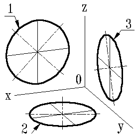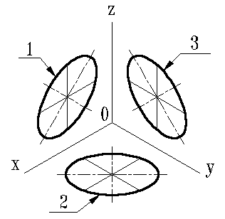1-эллипс (большая ось расположена под углом 900 к оси y); 2-эллипс (большая ось расположена под углом 900 к оси z); 3-эллипс (большая ось расположена под углом 900 к оси x).