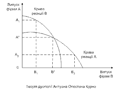 Наприклад, А виробляє товар в обсязі А1, тоді В буде вважати, що максимум прибутку він отримає, якщо поставить на ринок обсяг В1. Якщо ж у першого обсяг знизиться до А2, то другий збільшить свій продаж до В2. Таким чином іде свого роду гра між конкурентами, доки не досягається точка рівноваги – це точка з координатами